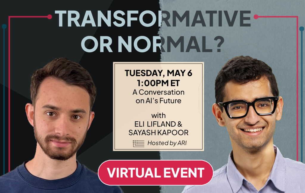 On Tuesday, May 6, Americans for Responsible Innovation (ARI) will host a virtual event with the co-authors of AI 2027 and AI as a Normal Technology providing a live debate on the transformative impacts of AI. Eli Lifland of AI Futures Project and Sayash Kapoor of Princeton University will participate in a timely exchange on AI’s trajectory and impact. Register now for a conversation with leading thinkers behind two of this year’s most thought-provoking AI research projects.