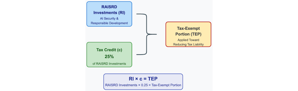 We propose implementing a voluntary tax incentive structure that rewards sustained investment in research on AI security and responsible AI development (RAISRD). The incentive would consist in a 25% tax credit for developers of frontier models with security and responsibility research programs. The credit would be calculated from RAISRD qualifying investments (explained below) and then applied toward reducing an AI developer’s tax liability, for example by making a portion of an AI developer’s income before taxes tax-exempt.2
