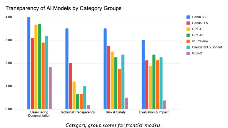 Our research also found a transparency divide between established tech companies and AI startups. Meta’s open-weight Llama 3.2 and Google’s Gemini 1.5 lead in transparency, scoring 88.9 and 62.5 out of 100, respectively. In contrast, the most advanced models from startups trail significantly, with OpenAI’s o1-preview scoring 44.7 and xAI’s Grok-2 managing just 19.4.
