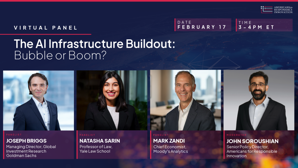 On Tuesday, February 17, join a virtual panel with economic experts from Goldman Sachs, Moody’s, Yale, and ARI to explore the economic and financial dimensions of the AI infrastructure buildout. The AI industry is undergoing an unprecedented buildout of data centers, chips, and energy infrastructure to power next-generation models. Proponents of the buildout believe these investments are justified and will fuel a major productivity boom, while critics express skepticism and believe the investments are fueling a financial bubble that will go bust.